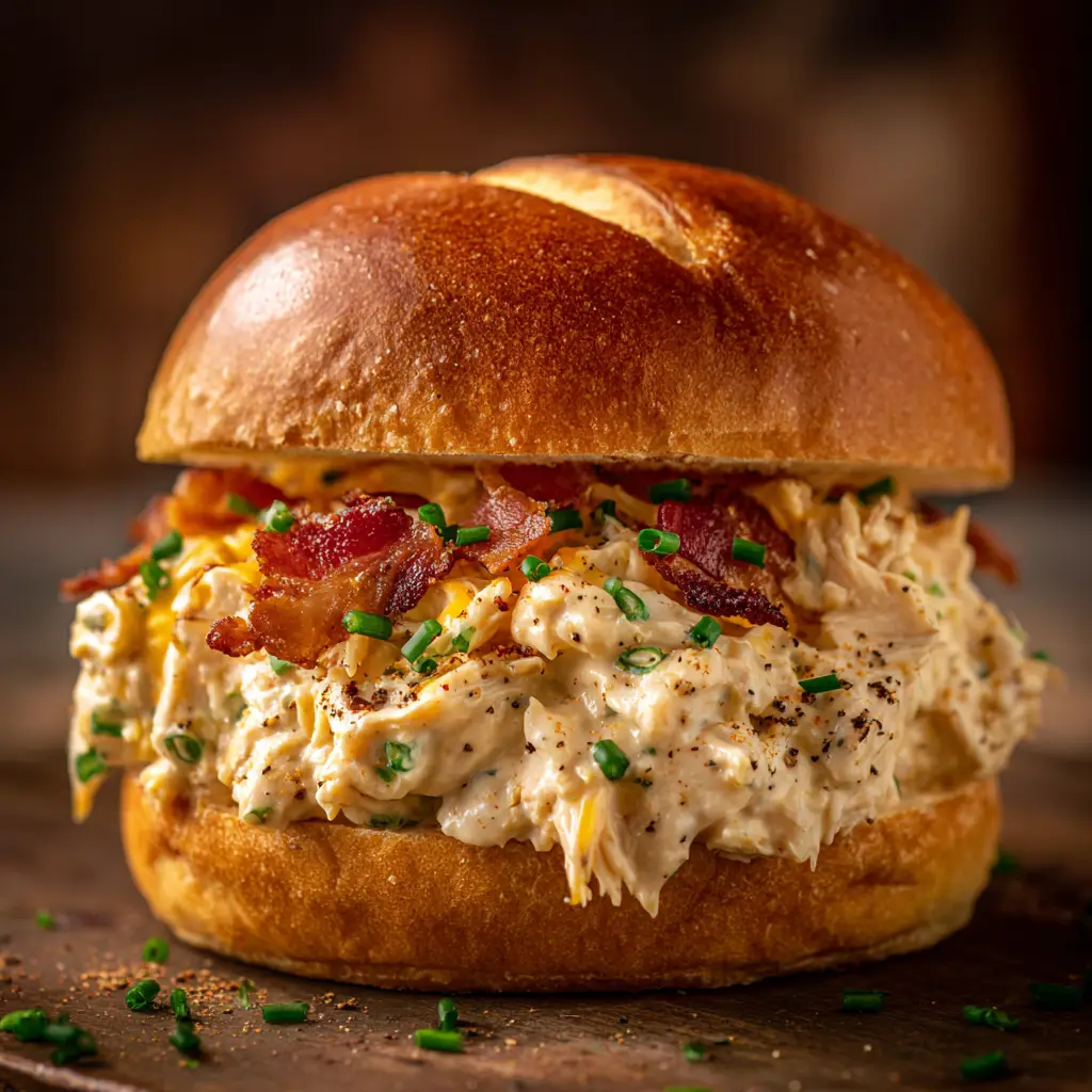 A delicious crack chicken sandwich on a brioche bun, overflowing with creamy shredded chicken, melted cheddar cheese, and bacon bits. The ultimate comfort food recipe.