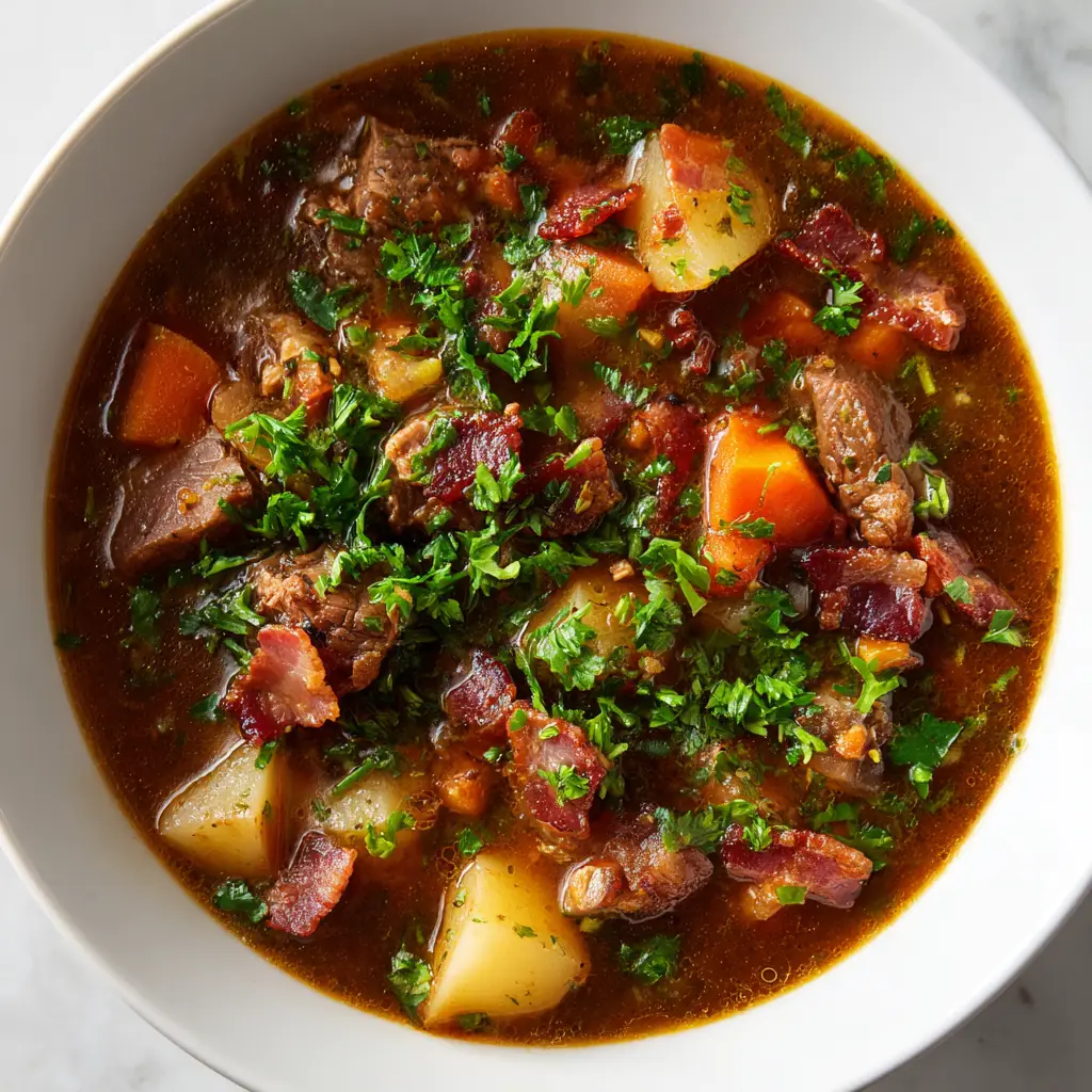 A close-up overhead view of hearty beef and bacon stew in a rustic bowl, highlighting the tender beef and vegetables in a savory broth.