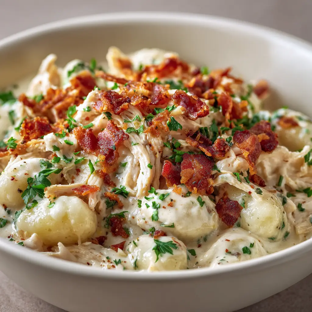 A rich and creamy crockpot meal featuring tender chicken, savory bacon, and cheesy ranch sauce tossed with soft potato gnocchi. The ultimate set-it-and-forget-it dinner that the whole family will love.