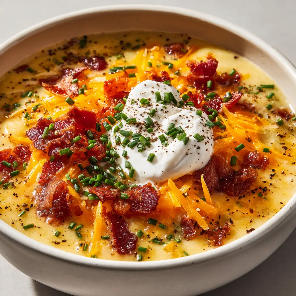 - Serve and Garnish: Ladle the hot soup into bowls and top with your favorite loaded baked potato toppings like crumbled bacon, extra cheese, sliced green onions, and a dollop of sour cream.