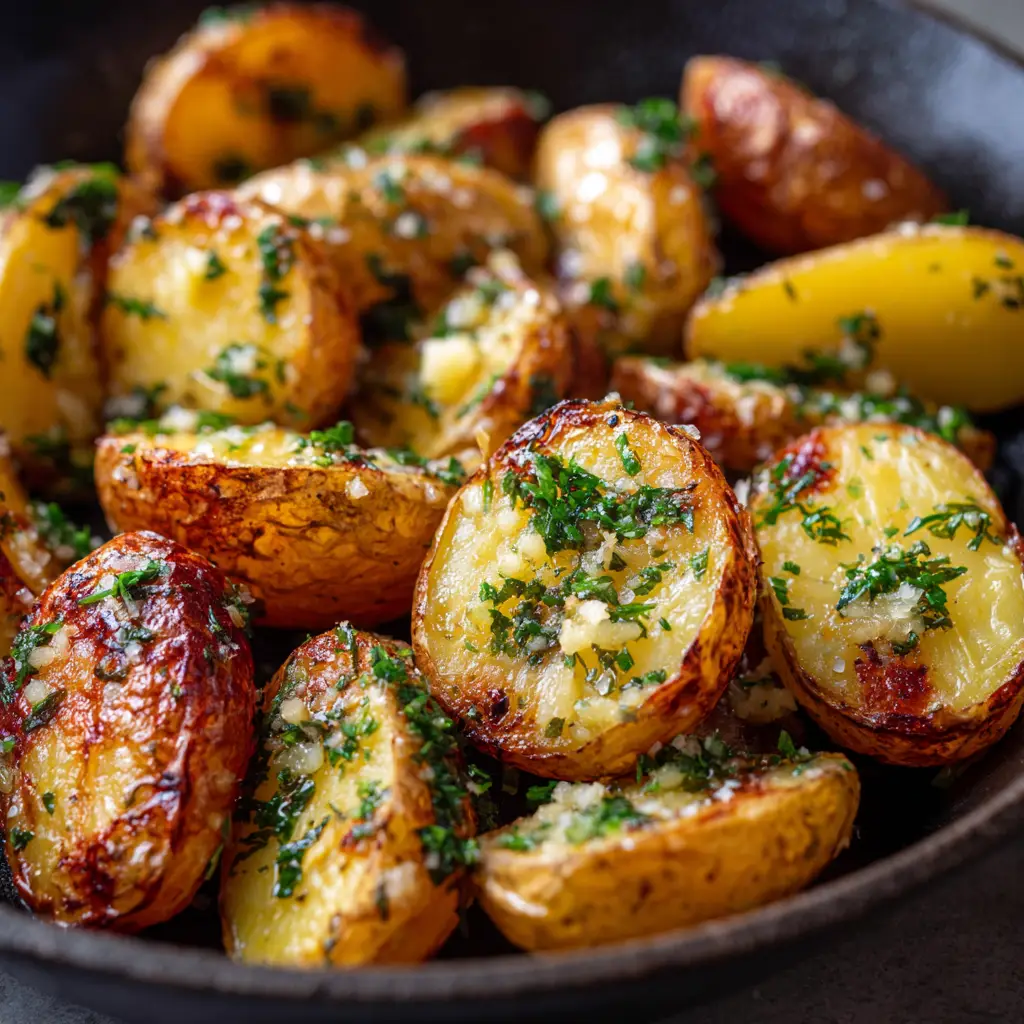 While the potatoes are in their final roasting phase, finely mince your roasted garlic cloves and chop your fresh rosemary and parsley. Once the potatoes are perfectly roasted, remove them from the oven. Immediately add the minced roasted garlic, chopped herbs, and a generous sprinkle of flaky sea salt. Toss everything together right in the hot skillet. The residual heat will bloom the herbs and garlic, releasing an incredible aroma.